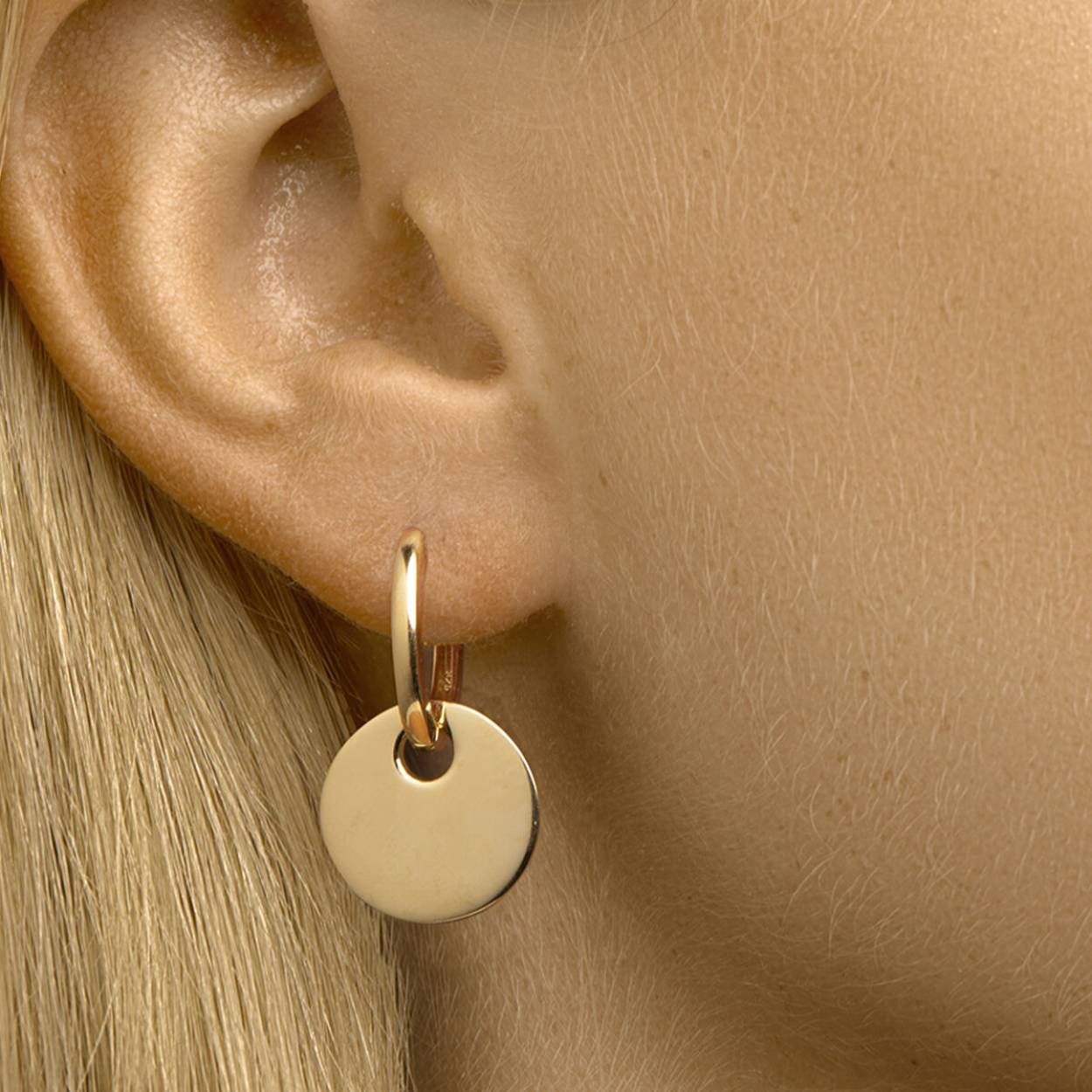 Geelgoud op 925 zilveren oorringen uitgevoerd met een hanger in de vorm van een rondje. De oorringen hebben een totale hoogte van 2.8cm. De hanger heeft een diameter van 16mm. Geen garantie op plating.